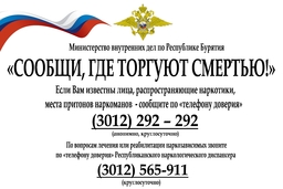 В период с 13 по 24 марта 2023 года на территории Мухоршибирского района проводится первый этап Общероссийской акции «Сообщи, где торгуют смертью!». Цель акции – привлечение общественности к участию в противодействии незаконному обороту наркотиков, сбор и проверка значимой информации, оказание квалифицированной помощи и консультаций по вопросам лечения и реабилитации наркозависимых лиц. Если у вас активная гражданская позиция и вы готовы оказать содействие сотрудникам полиции в выявлении и пресечении противоправных деяний в сфере незаконного оборота наркотиков, то можете обратиться в органы внутренних дел по телефону 102. А также если Вам известны лица, распространяющие наркотики, места притонов наркоманов - сообщите по «телефону доверия» 8(3012) 292-292. По вопросам лечения или реабилитации наркозависимых можете обратиться по «телефону доверия» Республиканского наркологического диспансера 8(3012)565-911.