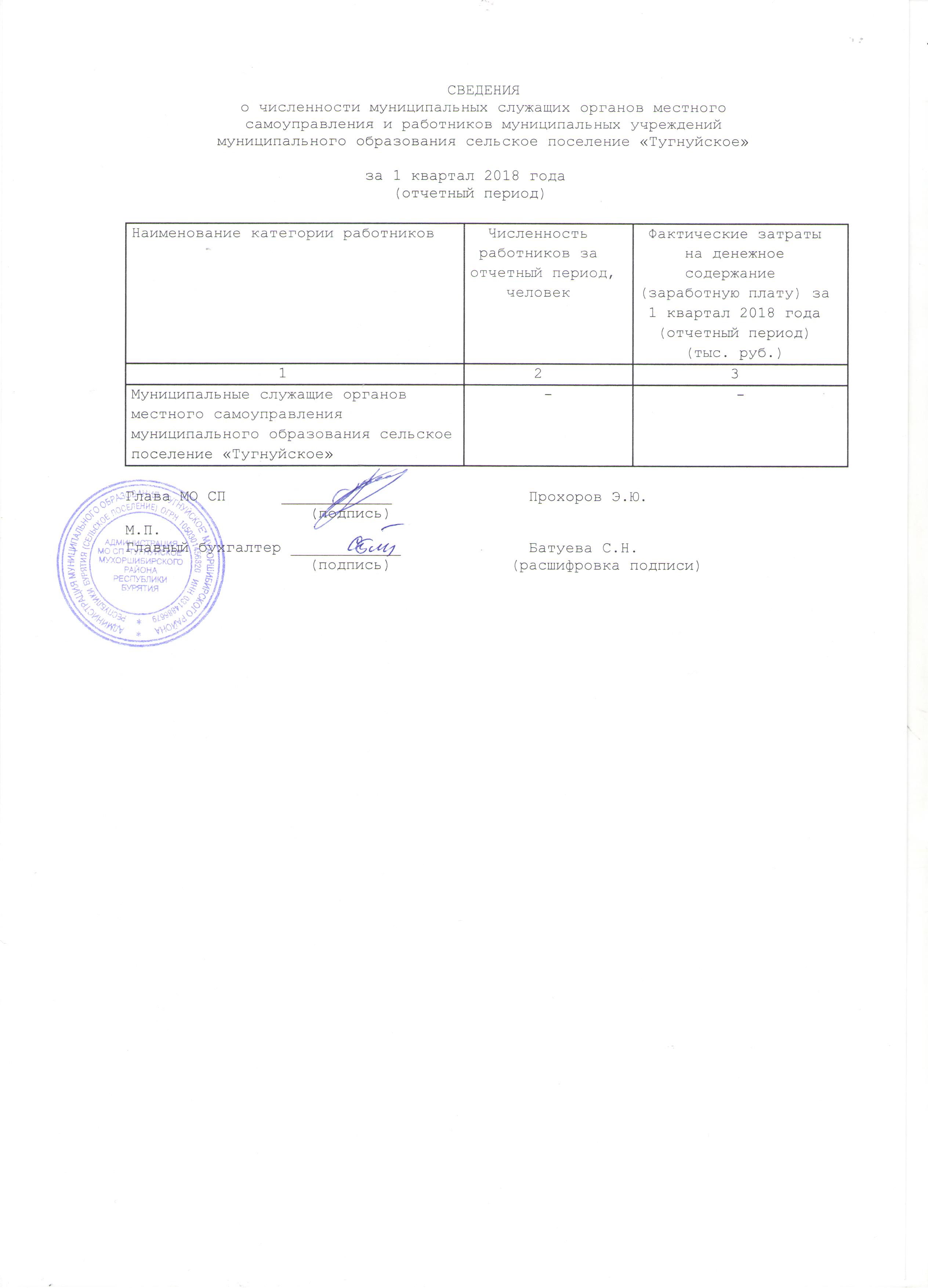 Cведения о численности муниципальных служащих МО СП "Тугнуйское" и фактических затратах на их денежное содержание за 1 кв. 2017 г.